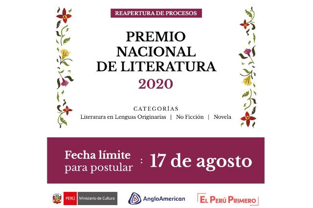 El Ministerio de Cultura anunció la reapertura del Premio Nacional de Literatura 2020, que comprende el reinicio de todos los procesos vinculados a este certamen desde el viernes 14 de agosto hasta el lunes 17 de agosto a las 16:30 horas.
