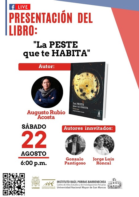 El Instituto Raúl Porras Barrenechea. Centro de Altos Estudios y de Investigaciones Peruanas de la Universidad Nacional Mayor de San Marcos, hace extensiva la invitación a lectores, escritores, docentes, investigadores y público en general, a la presentación del libro La peste que te habita (Arteidea, 2020), del escritor Augusto Rubio Acosta, actividad cultural que contará con el análisis y comentarios de los autores Jorge Luis Roncal y Gonzalo Pantigoso. Ingreso libre.
