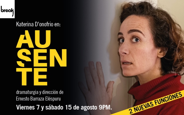 Para el mes de agosto BREAK presentará dos nuevas funciones del monólogo online AUSENTE, escrito y dirigido por el dramaturgo y director peruano Ernesto Barraza Eléspuru con la actuación de Katerina D’onofrio. A través de la plataforma virtual Joinnus live, se realizará los días viernes 7 y el sábado 15 de agosto a las 9PM.