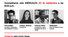 Este miércoles 23 de setiembre a las 8:00 p.m. nos acompañan dos arquitectos, Andrea Jiménez y Horacio Goitre, y el escultor Pool Guillén. Sus piezas de la subasta son un buen ejemplo del trabajo de diseño centrado en el metal. En las obras de los tres podemos ver la exploración de la forma y la atención puesta en el […]