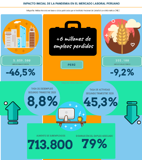 El azote más brusco del virus sobre el empleo en el país, implicó, de acuerdo a datos del Instituto Nacional de Estadística e Informática (INEI), la pérdida de más de 6 millones de empleos en el segundo trimestre del año, período que estuvo fuertemente marcado por la medida de confinamiento nacional para reducir el impacto de la transmisión y en cual, el desempleo aumentó a un récord histórico de 8,8%.