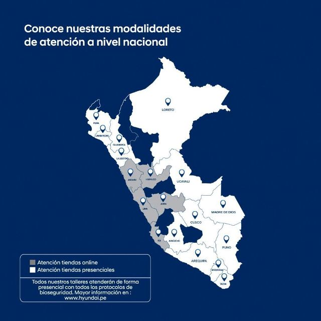 Las tiendas de Hyundai que se encuentran en los departamentos considerados de nivel extremo por la pandemia COVID-19 (Lima, Ica, Huancayo, Chimbote, Huánuco y Huaraz) brindarán atención de manera virtual para ventas y presencial para el servicio técnico, hasta el levantamiento de la cuarentena.