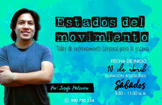 Con el objetivo de brindar a los actores en formación una amplia gama de herramientas para el desarrollo de sus personajes, este sábado 10 de abril inicia el taller Estados del movimiento: Taller de entrenamiento corporal para la escena dictado por el actor Jhosep “Josefo” Palomino. En esta primera etapa el taller tendrá ocho sesiones que se desarrollarán todos los sábados de 9:30 a 11:30 a. m. de manera virtual.