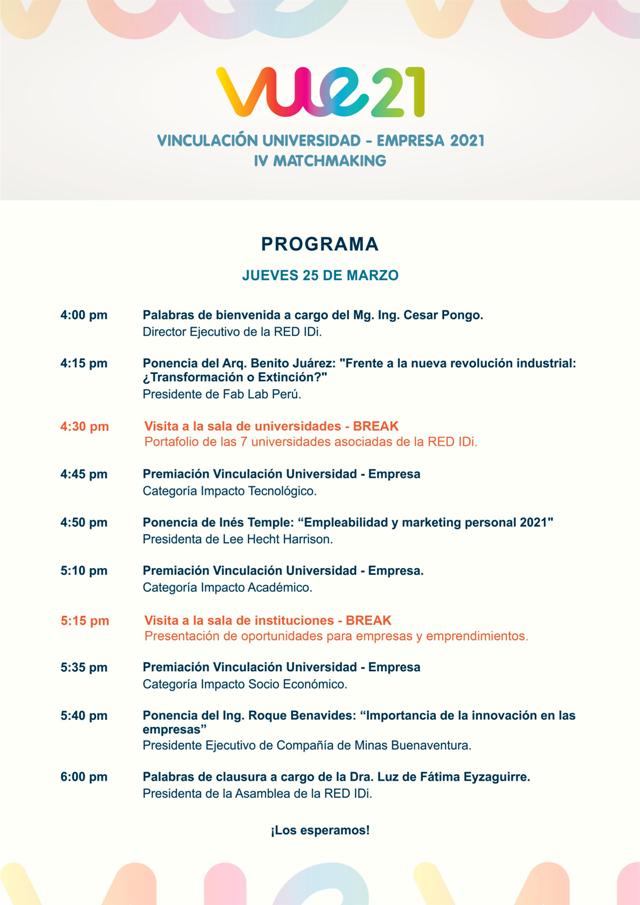 El Matchmaking VUE 2021, se realizará el 25 de marzo sin costo alguno, será trasmitido en la plataforma https://www.facebook.com/asociacionredidi El registro es a través de: www.vue-redidi.com.