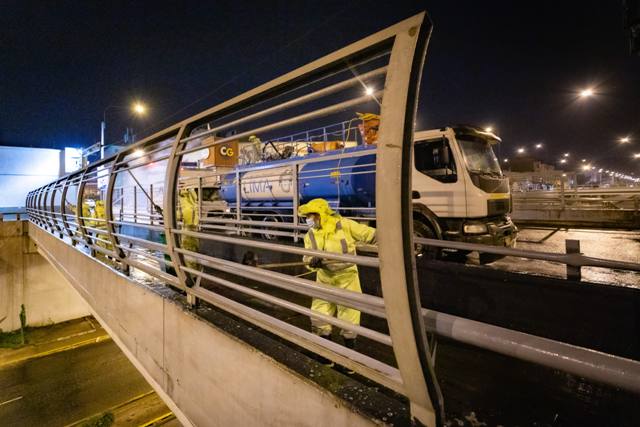 Con el objetivo de evitar la propagación del COVID-19, la Municipalidad de Lima, a través de Emape, realizó la limpieza, lavado y desinfección de 12 pasos peatonales, 10 paraderos, 10 rampas y un puente peatonal de la Vía Expresa Grau, en el centro de la ciudad.