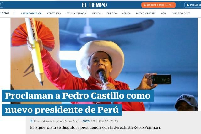 Medios de comunicación extranjeros informaron sobre la proclamación de Pedro Castillo como nuevo Presidente del Perú, tras señalar que se da luego de seis semanas de efectuarse la Segunda Vuelta Electoral contra la candidata del partido Fuerza Popular, Keiko Fujimori.