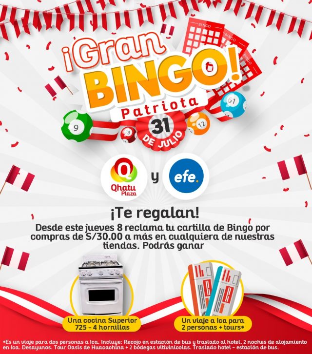 Qhatu Plaza, el mall vecinal ubicado en Santa Clara, Ate; invita a todos sus clientes y visitantes al “Gran Bingo Patriota” este 31 de julio, que será transmitido en vivo a través de las redes sociales de Qhatu Plaza https://www.facebook.com/QhatuPlazaSantaClara/.