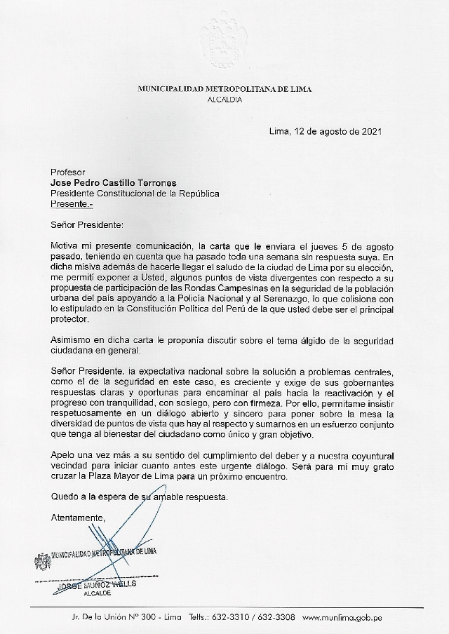 En virtud de que la primera carta enviada por el Alcalde de Lima, Jorge Muñoz al Presidente Pedro Castillo, no ha tenido ninguna respuesta hasta la fecha, el día de hoy, el burgomaestre limeño le ha vuelto a enviar una nueva carta.