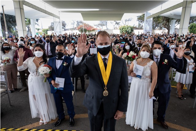 El evento, liderado por el alcalde de Lima, Jorge Muñoz, se realizó en las instalaciones del Circuito Mágico del Agua, donde solo asistieron las parejas y sus testigos, a fin de garantizar el distanciamiento social y respetar el aforo.