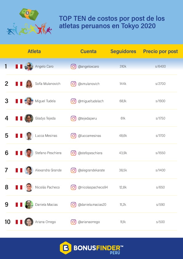 Instagram es una de las redes sociales que ha logrado una buena aceptación entre los jóvenes y jóvenes adultos. Por ello, BonusFinder Perú realizó un estudio de las peruanas y peruanos que nos representan en las Olimpiadas de Tokyo 2020, y grande es la sorpresa que el skater Ángelo Caro, supera en seguidores y costos a Sofía Mulanovich.