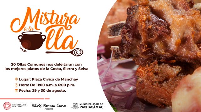Manchay, 28 de Agosto del 2021.-Con el objetivo de generar nuevas oportunidades, promover y reactivar el desarrollo económico del distrito, la Municipalidad de Pachacámac en coordinación con las gerencias de Desarrollo Humano y Desarrollo Económico, llevarán a cabo el primer evento gastronómico denominado “Mistura a la Olla”. Para conquistar los paladares nacionales e internacionales.