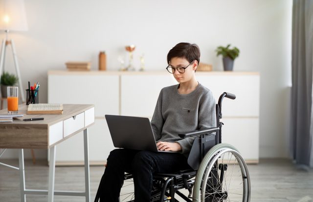 Focused teen boy in wheelchair using laptop computer for online schooling or communication at home. Hardworking disabled adolescent studying online, talking to his private tutor
