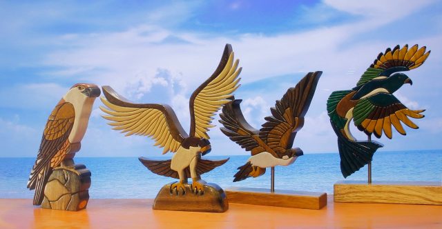 esculturas en madera de gran calidad, objetos decorativos, belenes, figuras folklóricas de las tres regiones del Perú (Costa, Sierra y Selva), animales, aves, peces,