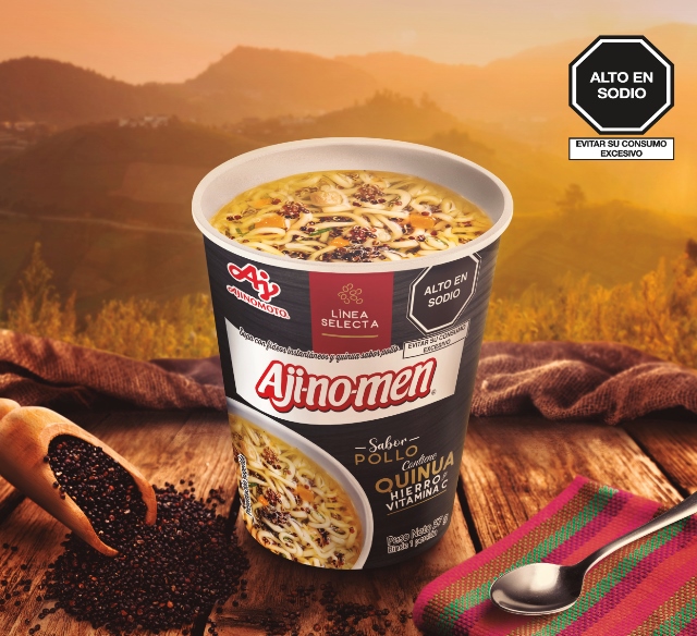 “Con nuestro concepto de los andes a tu sopa Aji-no-men® Vaso sabor Pollo con Quinua es la primera sopa de la línea selecta. Además de tener un insumo tan nutritivo como la quinua roja, contiene hierro y vitamina C, lo cual responde a nuestro compromiso global de valor compartido que es promover una alimentación saludable”, menciona María Teresa Tapia, gerente de Marketing.