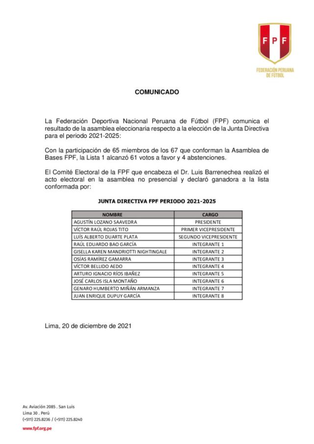 El 93,8% de Asambleístas presentes votaron a favor de la nueva Junta Directiva FPF 2021-2025