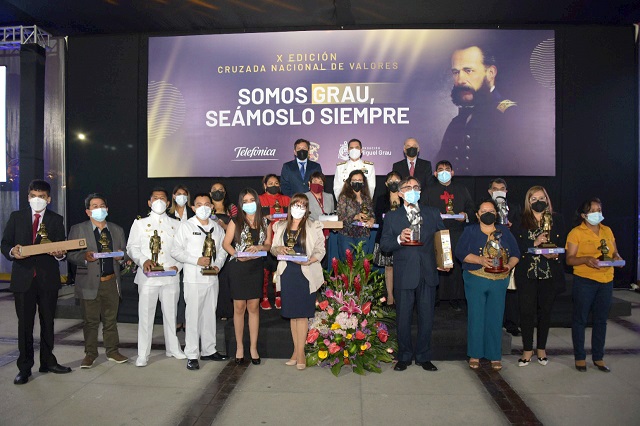 Lima, 11 de Diciembre de 2021.- Por décimo año consecutivo, la Marina de Guerra del Perú, la Fundación Miguel Grau y Telefónica entregaron el Premio Nacional Almirante Miguel Grau. El reconocimiento forma parte de la X Cruzada Nacional “Somos Grau, Seámoslo Siempre”, cuyo objetivo es incentivar en la población los valores cívicos, morales y patrióticos que caracterizaron al Héroe de Angamos.