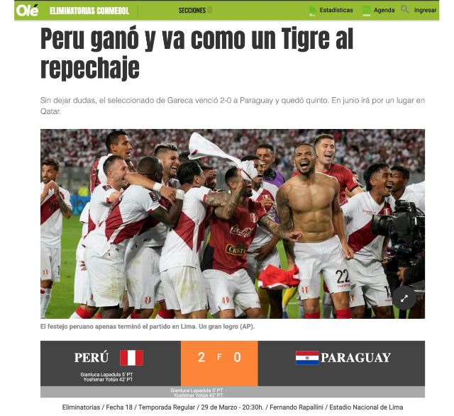 “Perú ganó y va como un tigre al repechaje”, tituló el diario argentino Olé, que también resaltó que la clasificación no dejó dudas sobre el merecimiento de la Blanquirroja por ocupar el quinto lugar en la tabla de posiciones.