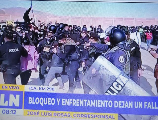 Ica, 6 de Abril del 2022.- Una persona muerta deja hasta el momento el violento enfrentamiento entre la Policía y cientos de manifestantes que bloquean el kilómetro 290 de la carretera Panamericana Sur, en la zona conocida como Expansión, en el ingreso al distrito de Salas-Guadalupe.