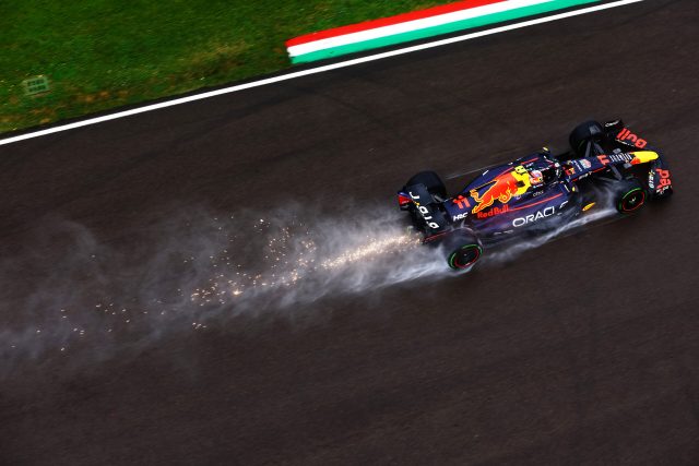 IMOLA, ITALY – APRIL 22: Sparks and water spray fly behind Sergio Perez of Mexico driving the (11) Oracle Red Bull Racing RB18 on track during practice ahead of the F1 Grand Prix of Emilia Romagna at Autodromo Enzo e Dino Ferrari on April 22, 2022 in Imola, Italy. (Photo by Mark Thompson/Getty Images) // Getty Images / Red Bull Content Pool // SI202204220244 // Usage for editorial use only //