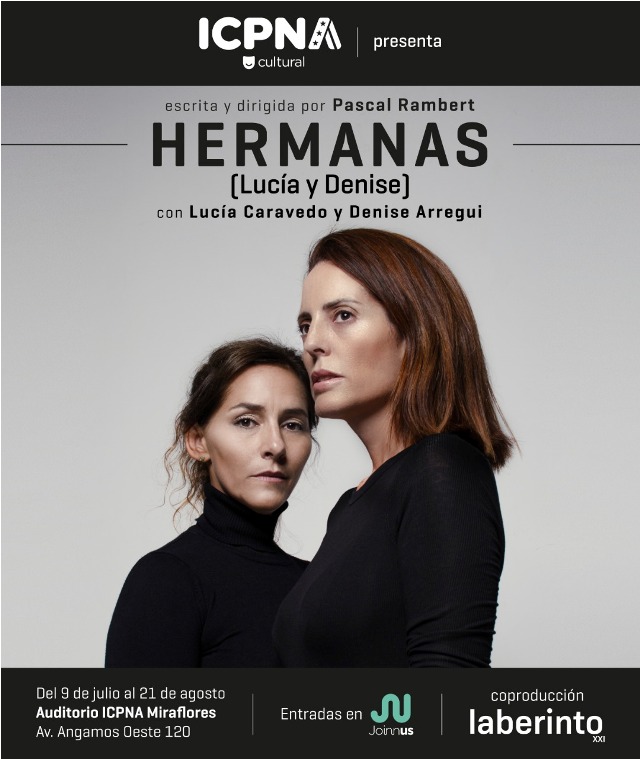 “Hermanas” va del 9 de julio al 21 de agosto, en funciones todos los viernes y sábados a las 8 p. m. y domingos a las 7 p. m. en el Auditorio ICPNA Miraflores, Avenida Angamos Oeste 120, Miraflores. Las entradas están en pre venta hasta el 8 de julio a S/30. A partir del 9 de julio: entrada general S/45, adulto mayor S/30 y estudiantes S/25. Disponibles en Joinnus https://bit.ly/3LNgGWt