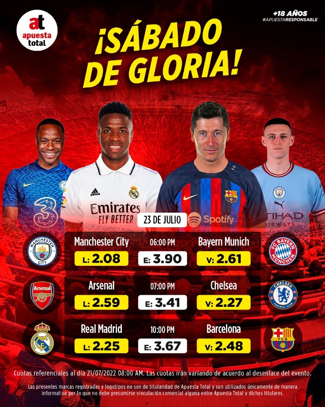 Lima, 23 de Julio del 2022.-Luego de una pausa, los equipos grandes de Europa regresan al ‘verde’ para endulzar nuestros días. Y como parte de su pretemporada, este sábado tenemos 3 partidazos: Manchester City vs. Bayern Múnich, Arsenal vs. Chelsea, y Real Madrid vs. Barcelona, que lucirán a sus respectivos fichajes que, como siempre, han remecido el mercado de pases. Por supuesto, en las casas de apuestas ya se habla de los clásicos del fin de semana.