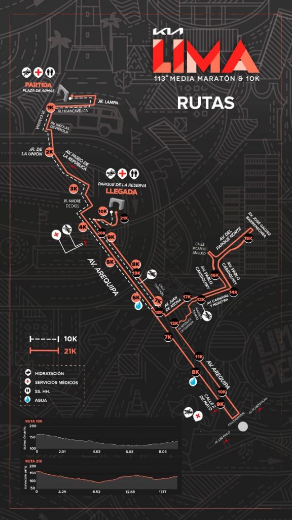 La ruta para los 10K será por el Jirón de la Unión, Paseo de los Héroes Navales, Paseo de la República y la Avenida Arequipa. Por su parte, el trayecto de 21K tendrá un camino adicional por Canaval y Moreyra, Carriquiry, Del Parque Norte y Juan de Arona.
