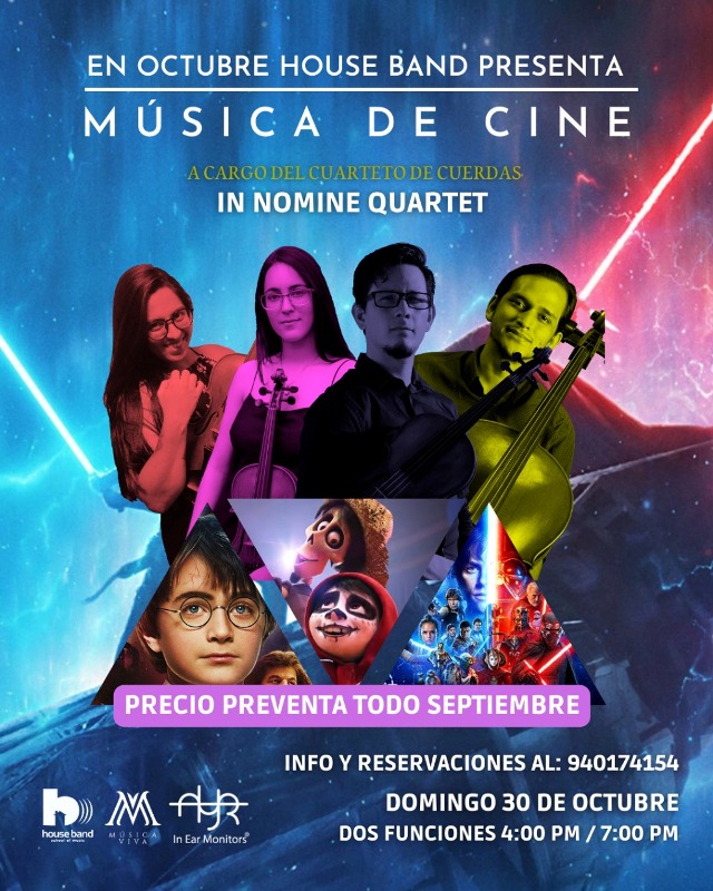 HOUSE BAND PERÚ, es una escuela de música que ofrece diversos programas para niños, jóvenes y adultos que busca desarrollar una formación integral musical y artística en sus alumnos. El cuarteto de cuerdas IN NOMINE QUARTET está conformado por Ceci Tuesta (violín) Andreína Flores (violín) Daniel Sáenz (viola) y Juan Dávila (violoncello), cuarteto con más de 4 años continuos de vida artística dedicado a fusionar la música clásica y popular en un solo lenguaje.