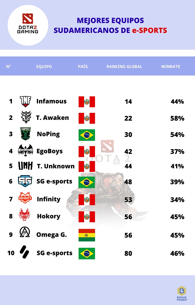 El team Infamous es el primer sudamericano en ranking mundial (14º), seguido por el también nacional Thunder Awaken (22º) y los brasileños NoPing e-sports (30º).