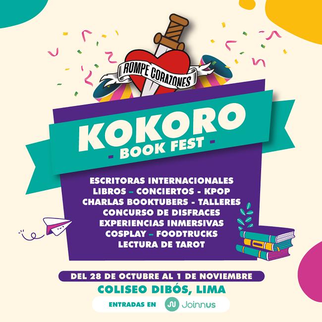 Kokoro Book Fest es el primer evento que reúne a las estrellas de la literatura juvenil con los lectores más apasionados del mundo, mediante un formato que rompe los esquemas de las ferias literarias tradicionales. Su primera edición se llevará a cabo del 28 de octubre al 1 de noviembre en el coliseo Dibós, Lima, donde ademásde la venta y exposición de libros, buscamos ofrecer actividades que despierten emociones entre el público lector joven.