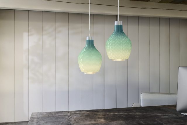 Las lámparas terminadas vienen en siluetas orgánicas y el mismo color verde azulado característico de las redes de pesca. Cuando se enciende, el material reciclado muestra degradados de tonos azul verdosos y pequeñas irregularidades que hacen que cada lámpara sea única. La luz suave y difusa revela la textura 3D de la pantalla. Las texturas están inspiradas en el mar: dunas de arena, agua ondulante y escamas de pescado.
