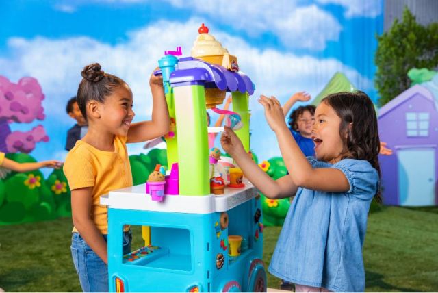 - Peppa Pig Clubhouse: Inspirado en el lugar de la serie, el playset cuenta con una pared móvil que representa un puesto de comida y una panadería. Hay muchos accesorios que te ayudarán a decidir, como un horno/caja registradora, 2 sillas con una mesa giratoria y un puesto de venta. Incluso hay un tobogán desmontable y un columpio de neumático para divertirse al aire libre, y un banderín para colocar en el techo. Precio sugerido: S/. 249.90