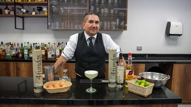 huevo, pisco puro quebranta, jarabe de goma, hielo y bitter. Roger Díaz, bartender sommelier, catador de