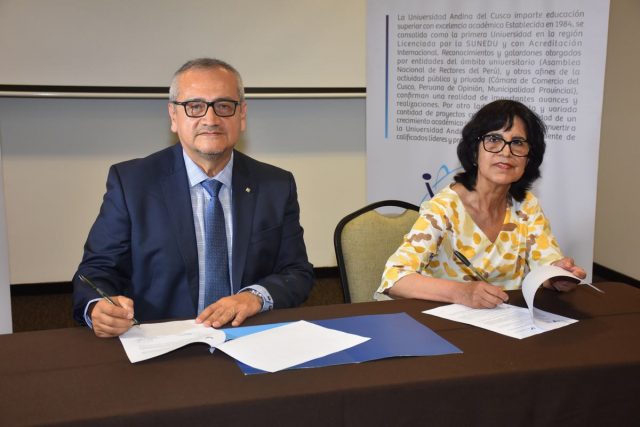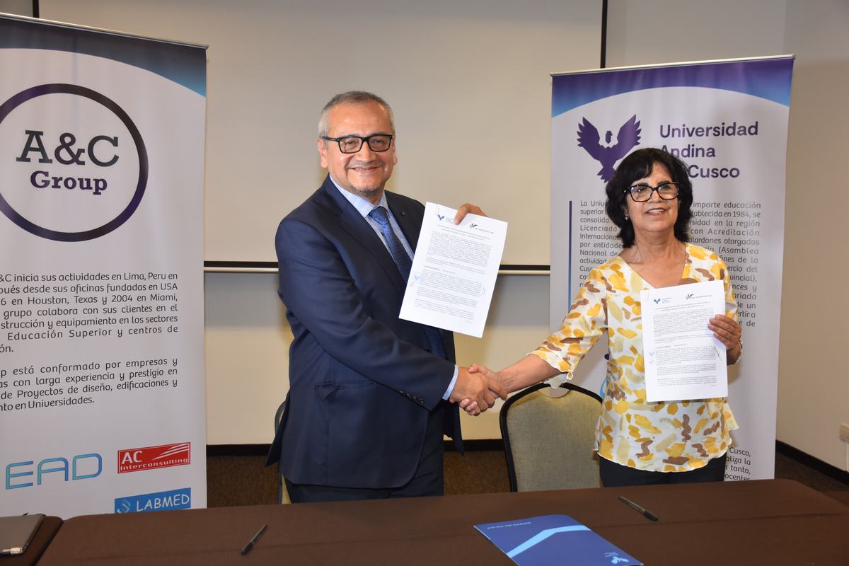 Hoy se realizó la firma de convenio de colaboración interinstitucional, entre la universidad Andina de Cusco (Perú), a cargo de la Dra. DI-Yanira Bravo Gonzales, rectora de dicha universidad y el grupo A&C a nivel mundial, presidida por el Ingeniero Enrique Aguinaga.