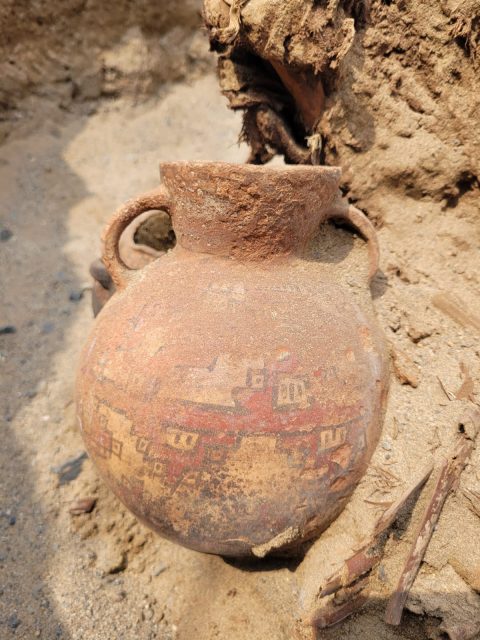 «El primer fardo se encontró con un cántaro y una olla tricolor, mientras que el segundo fardo estaba acompañado de una botella tipo cantimplora y un plato de cerámica», explicó Caravedo.