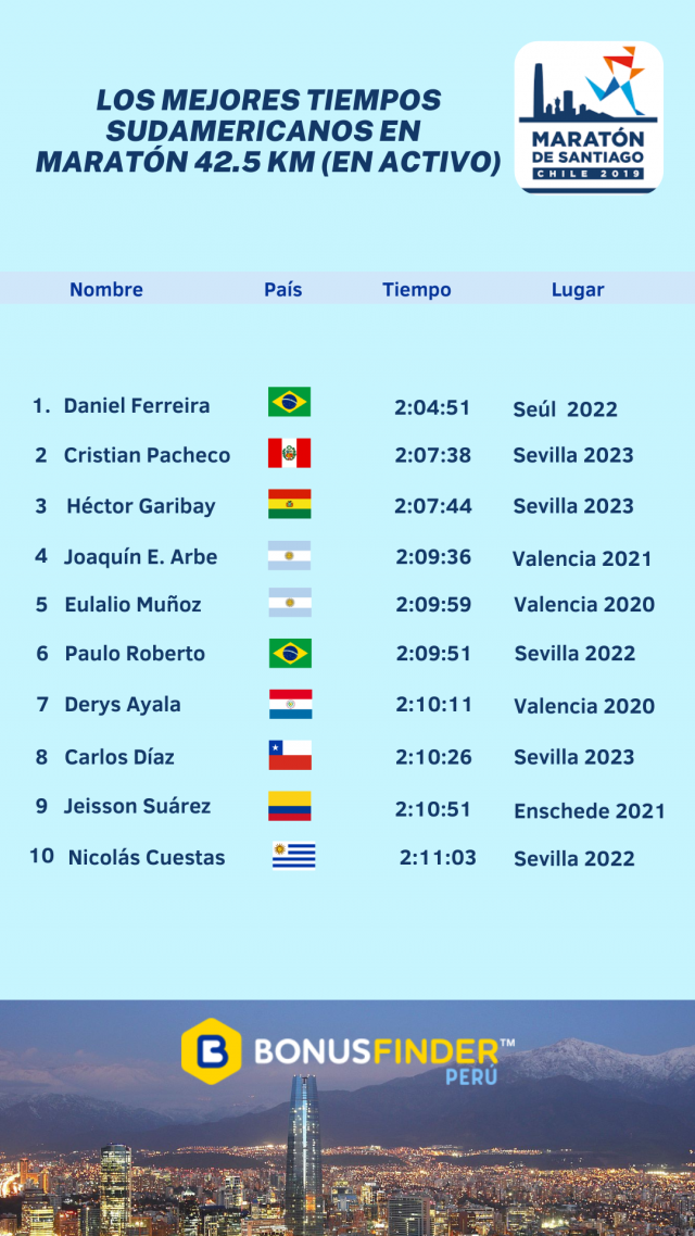 Lima, mayo de 2023. BonusFinder, el primer agregador mundial de ofertas y bonos de casinos y casas de apuestas online, ha querido calentar el ambiente para la Maratón de Santiago. Para ello ha realizado un análisis de los atletas sudamericanos de maratón en activo con los mejores tiempos.