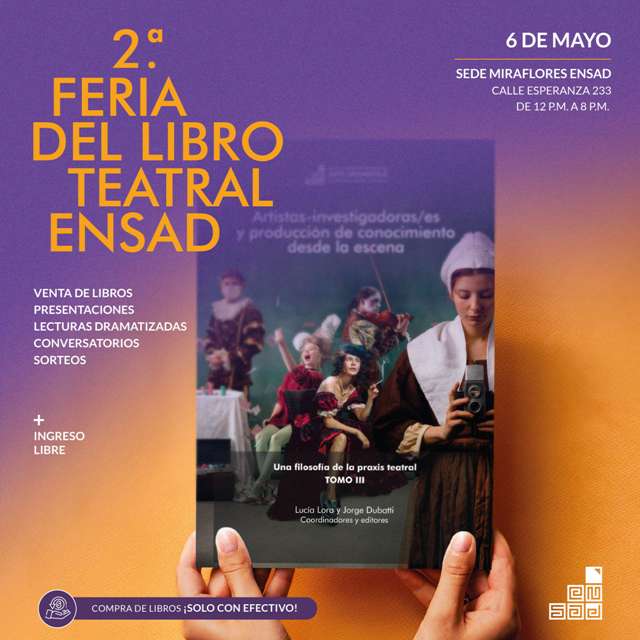 Desde hace dos años, el Fondo Editorial ENSAD organiza la Feria del Libro Teatral como un espacio ideal para encontrarse con sus lectores y seguir difundiendo las diversas publicaciones de su catálogo. Cuenta con libros de teoría teatral contemporánea, estudios en artes escénicas con enfoque latinoamericano, dramaturgia peruana consagrada y joven, así como revistas que abordan la creación escénica y la pedagogía teatral. En esta segunda edición, estarán a la venta las publicaciones físicas y las publicaciones digitales se compartirán a través de postales gratuitas que tendrán un QR de acceso liberado.