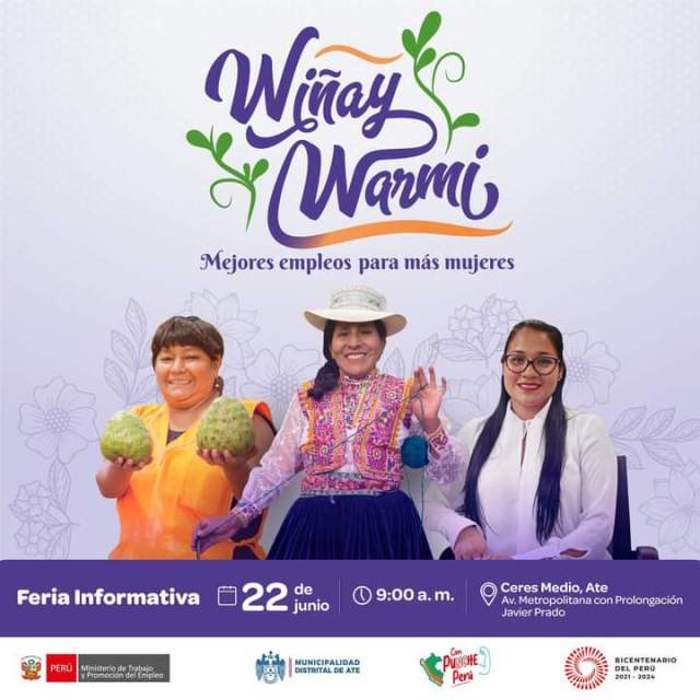 Ate, 23 de Junio del 2023.- Gracias a la gestión del Alcalde Franco Vidal, ante el Ministerio de Trabajo y Promoción del Empleo, el próximo 22 de Junio se llevará a cabo el Lanzamiento de la Intervención Intersectorial “Wiñay Warmi”, cuya finalidad es contribuir el cierre de brechas de género en el acceso al empleo decente y condiciones de empleabilidad de las mujeres en su diversidad.