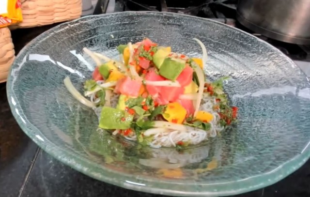 ¡Si deseas probar una versión fusión del ceviche debes preparar esta receta! Para dos porciones, primero cortar 120 g de atún en dados, y hacer lo mismo con 80g de mango y palta. Aparte, pasar 60g de fideos de arroz por agua caliente y reservar. Luego colocar 80gr de cebolla blanca en juliana, cortar en cuadraditos los 20 g de tallos de culantro, sin las hojas. Luego picar finamente 10g de ají limo rojo y reservar. Mezclamos en un bol el atún, mango, palta y demás ingredientes.