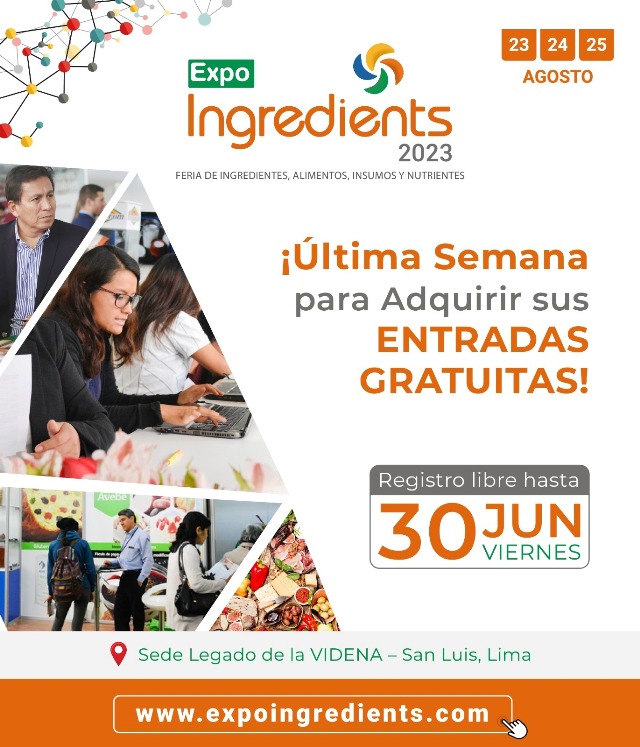 Hasta el viernes 30 de junio serán las inscripciones para poder solicitar sus pases gratuitos para la Feria Expo Ingredients 2023 ha realizarse del 23 al 25 de agosto en la Sede Legado de la VIDENA en San Luis.