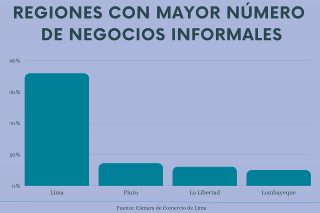 A nivel de regiones, el mayor número de negocios informales se concentra en Lima con un 35.9%, lo sigue Piura con 7.2%, La Libertad con 6.1% y Lambayeque con 5.0%. En cuanto a la actividad económica que desempeñan este tipo de negocios informales, la mayoría son en las áreas Comercio (34.2%), después Transporte y almacenamiento (22.2%) y Alojamiento y restaurantes (12.6%).