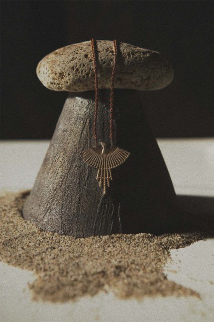 “Cao, señora Moche”, la nueva colección de joyería de Lorena Pestana, cuenta con iconografías ancestrales como tributo a la poderosísima Señora de Cao, mujer líder de la Cultura Mochica. Las joyas toman el simbolismo mochica, el poder femenino, el mar y la tierra, el lenguaje de cuentas, mostacillas y colgantes, y el manejo detallado de los metales, para proponer una colección de piezas que reinterpreta el ajuar de la Señora de Cao. Su proceso de diseño involucra meses de lectura y observación. Además, convocó a María Teresa Vela Mostaccero (Aestre Joyas), artista peruana que trabaja el metal artesanalmente.