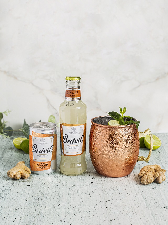 En una taza de mule, servir hielo, luego colocar 2 oz de Vodka, 0.5 oz de jugo de limón y 150 ml de Britvic Ginger Beer. Finalmente, puedes decorar con una rodaja de limón y un penacho de menta.