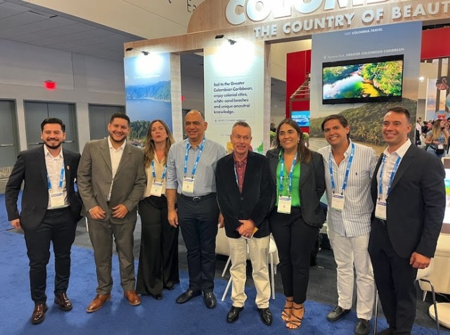 Durante Seatrade Cruise Global 2024 en Miami, Florida: Erick Navarro, asesor de Promoción Turística de Santa Marta; Andrés Mesa, Gerente Comercial Colombia 57; Ana María Orozco, vicepresidente del Puerto de Santa Marta; Carlos Pinedo Cuello, Alcalde de Santa Marta D.T.C.H; Brendan Raymant, Director Comercial Colombia 57; Silvia Medina, Presidenta de la Cámara de Comercio de Santa Marta; José Domingo Dávila, Director de Indetur Santa Marta y Alex Griffith, CEO de Vívolo Café