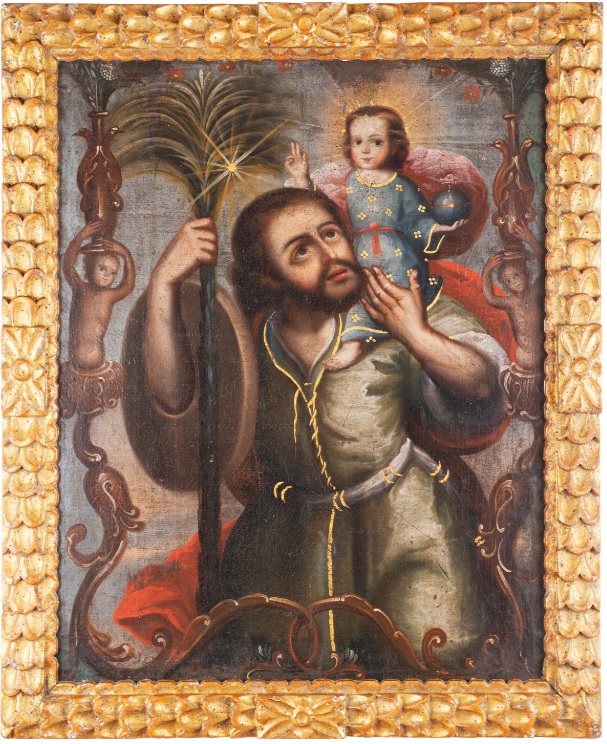 En el cuadro se representa al lado izquierdo a San José, en medio cuerpo y sosteniendo al Niño Jesús, quien le corona con una guirnalda de flores. Al lado derecho del lienzo, está San Cristóbal, en medio cuerpo, que con la diestra sostiene una palmera y sobre el hombro izquierdo carga al Niño Jesús en majestad.