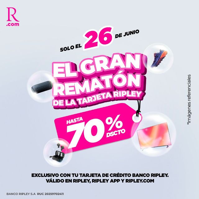 Lima, 24 de Junio del 2024.- Banco Ripley anuncia la llegada del «Gran Rematón», un evento sin igual que se llevará a cabo este 26 de junio. En este evento, se ofrecerán descuentos incomparables en una amplia gama de productos, desde celulares, laptops, y mucho más, a un gran precio.