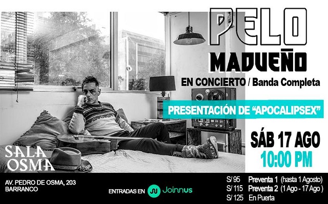 Lima,15 de Agosto del 2024.- Pelo Madueño, compositor de clásicos del rock peruano como “Mala Sangre” o “Alma de 80’s”, nos presentará en concierto su nuevo disco “APOCALIPSEX” con una nueva banda de músicos, una nueva puesta escénica y nuevo espectáculo.