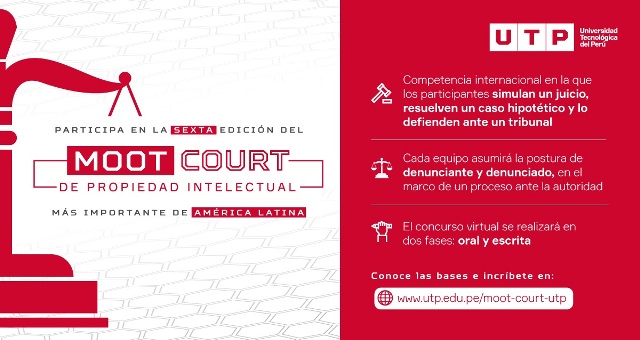 En esta edición, las inscripciones ya se encuentran abiertas y concluirán el próximo 18 de octubre. Para registrarse y conocer más detalles sobre las bases, los alumnos pueden ingresar al siguiente enlace https://www.utp.edu.pe/moot-court-utp. Además, el Moot Court de Propiedad Intelectual de la UTP premia con 5,000 dólares al ganador.