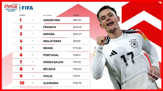 El trío de cabeza está en un pañuelo. Aunque Argentina (1ª) se mantiene en la cumbre, solo supera a Francia (2ª) y a España (3ª) por un puñado de puntos. Inglaterra (4ª) y Brasil (5ª) no cambian, al tiempo que Portugal (6ª, +1) y Países Bajos (7ª, +1) avanzan un puesto cada una. Bélgica pierde dos (8ª, -2) mientras que Italia (9ª) sigue invariable en un top 10 muy reñido al que regresa Alemania (10ª, +1).