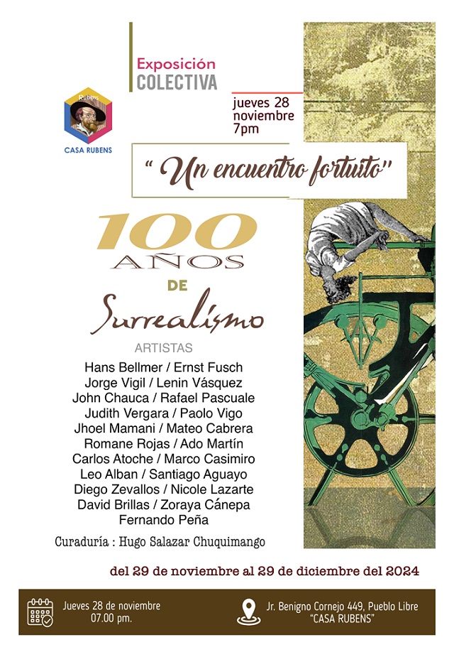“Un encuentro fortuito. Conmemoración del Surrealismo” se puede visitar en Casa Rubens de Pueblo Libre (calle Benigno Cornejo 447, altura de la cuadra 24 de la Av. Brasil) hasta el 29 de diciembre, de martes a domingo de 10 a.m. a 7 p.m.