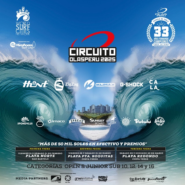Lima, 31 de Enero del 2025.-La escuela de tabla Olasperú, fundada hace 33 años por el reconocido y legendario tablista Roberto “Muelas” Meza, inicia la temporada presentando una nueva edición del Circuito Olasperú 2025, que se llevará a cabo este verano y cuya primera fecha se disputa en Playa Norte de San Bartolo este 31 de enero y 1 de febrero. Las acciones inician a las 8am y se extenderán en ambos días hasta pasada las 4pm.